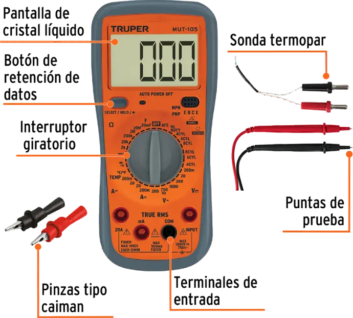 El Truper MUT-105 es un multímetro digital profesional True RMS diseñado para técnicos e ingenieros que buscan precisión y durabilidad. Su sistema autorango permite medir automáticamente el rango adecuado en cada lectura, evitando errores y agilizando el trabajo. Ideal para diagnóstico eléctrico, mantenimiento industrial, automotriz o uso doméstico avanzado.