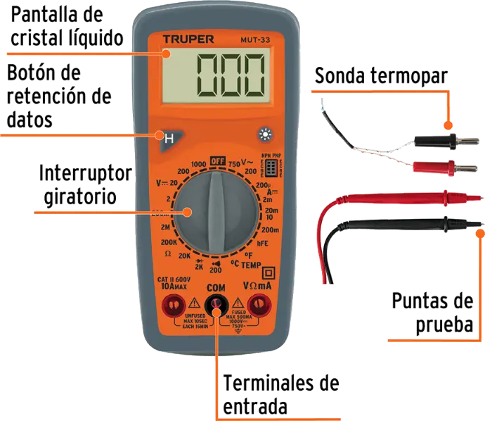 El MUT-33 Truper está fabricado bajo estándares de calidad profesional, ofreciendo precisión, durabilidad y estabilidad en las mediciones. Perfecto para revisar baterías, fuentes de alimentación, conexiones eléctricas, componentes electrónicos y mucho más.
