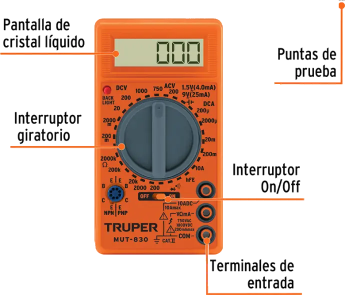El multímetro digital TRUPER MUT-830 es una herramienta práctica diseñada para técnicos, estudiantes y aficionados que requieren realizar mediciones eléctricas de manera sencilla y precisa. Su pantalla LCD ofrece una lectura clara y rápida, con su display con ilimuninacion facilitando su lectura.